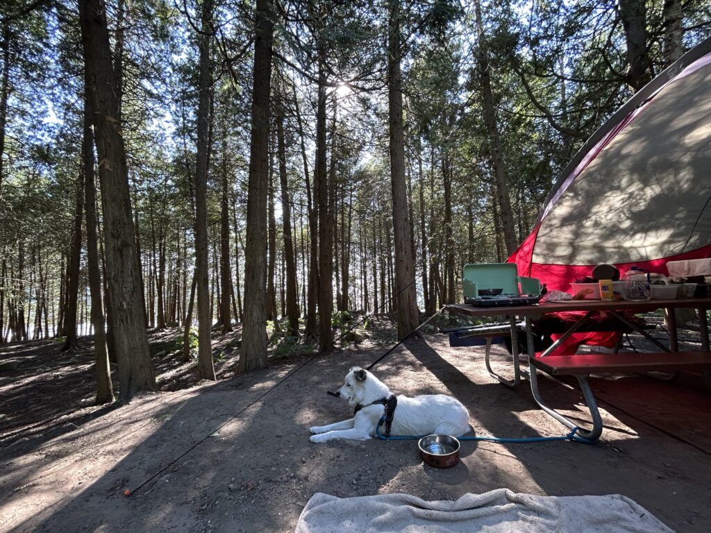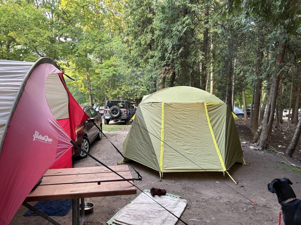 Unfortunately, the campground was marginal because the sites were too close together. Also, it was very dusty and undoubtedly muddy when it rained. On the positive side, the restrooms and showers were nice enough. We had a decent site that backed up to the woods above the lake. Overall, we enjoyed our two-night stay. Of course, while we were there, the dogs enjoyed a few swims.